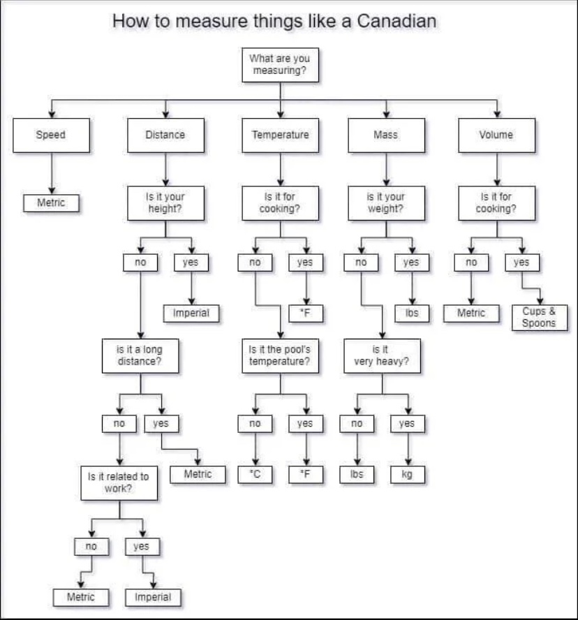 Официално Канада се води, че използва метричната система, но реално е някакъв микс. Ето картинка за унагледяване, кога къде се употребява.